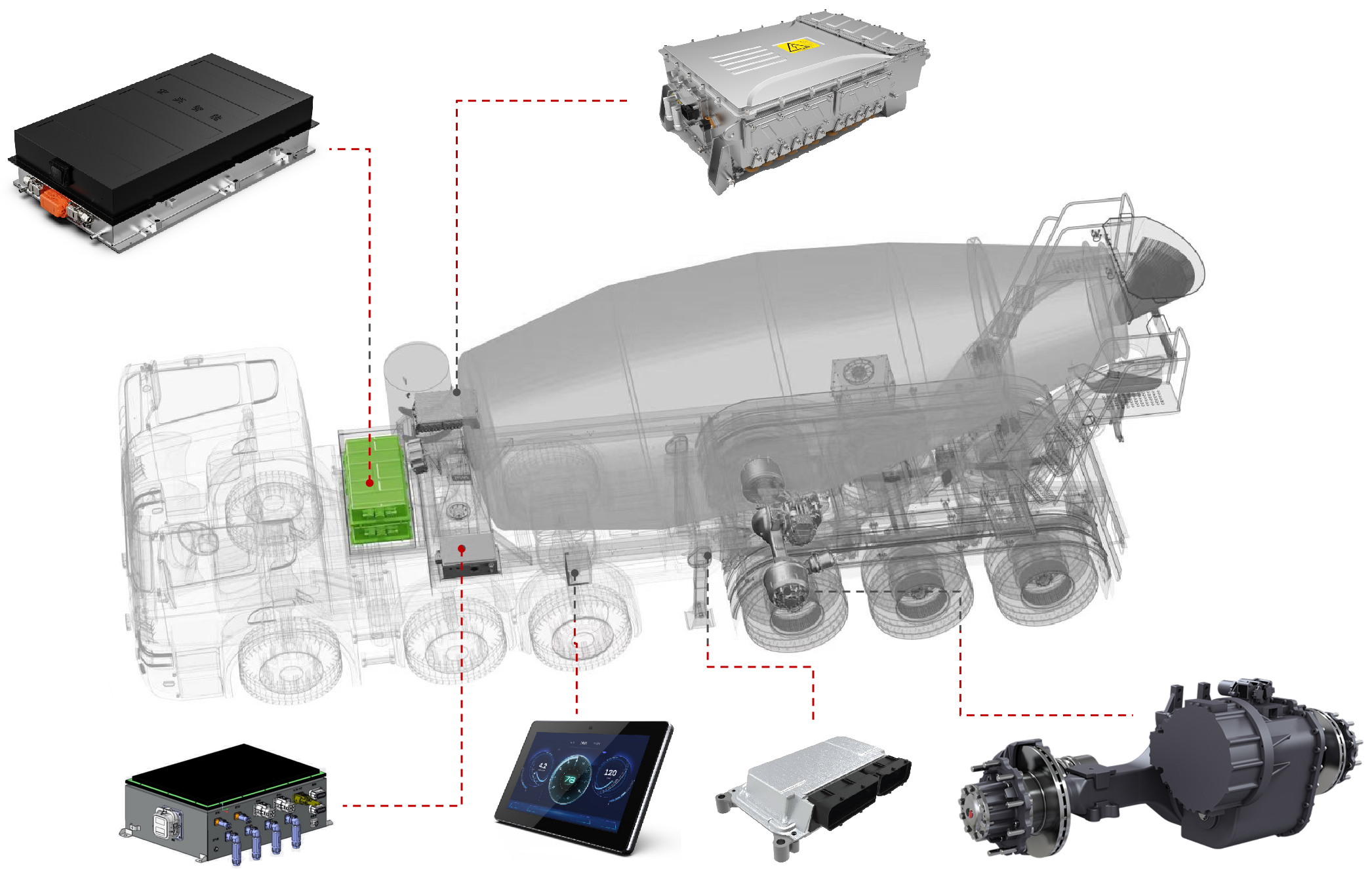展会上,九游ninegame智能的智电一体化解决方案引起了广泛关注。工程师团队在现场为参展观众详细介绍了混合动力牵引搅拌半挂车的系统方案。该方案基于九游ninegame智能历经多年开发的eMagi智电平台,针对牵引搅拌半挂车进行了定向开发,涵盖以下几个方面: